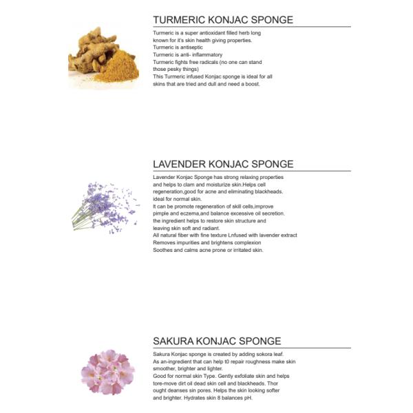 7 different Konjac sponges offered: pure natural, bamboo charcoal black, French red clay, green tea/aloe, cherry, turmeric, lavender.
